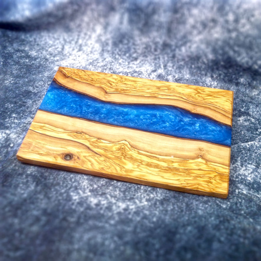Sun-drenched olive groves meeting the crystal-clear waters of a hidden cove. European olive wood and custom-blended epoxy resin.