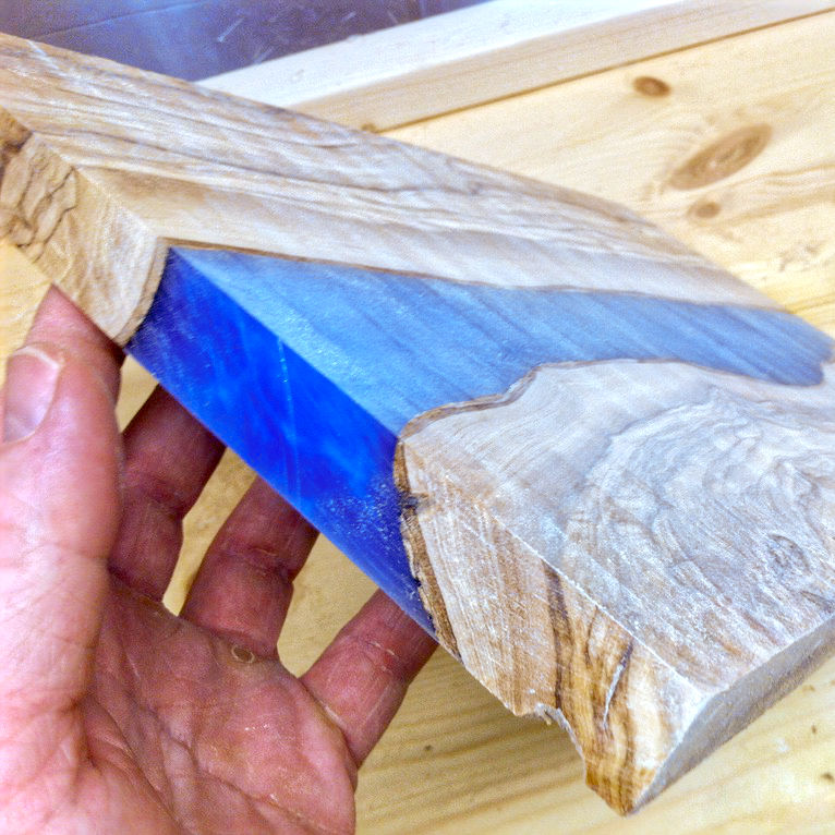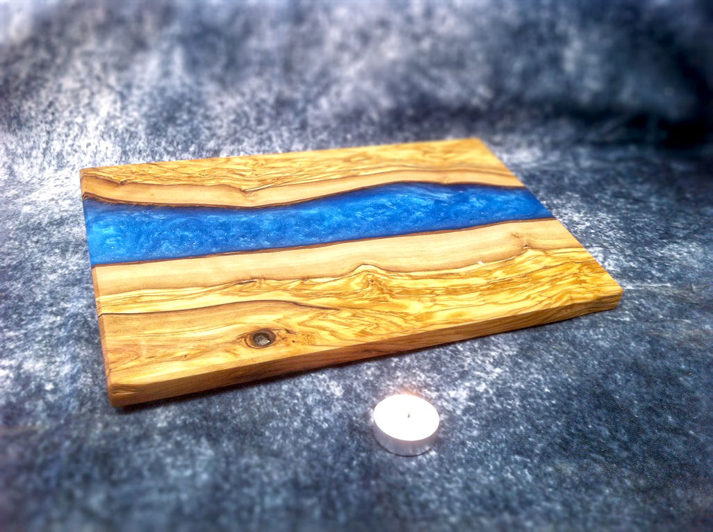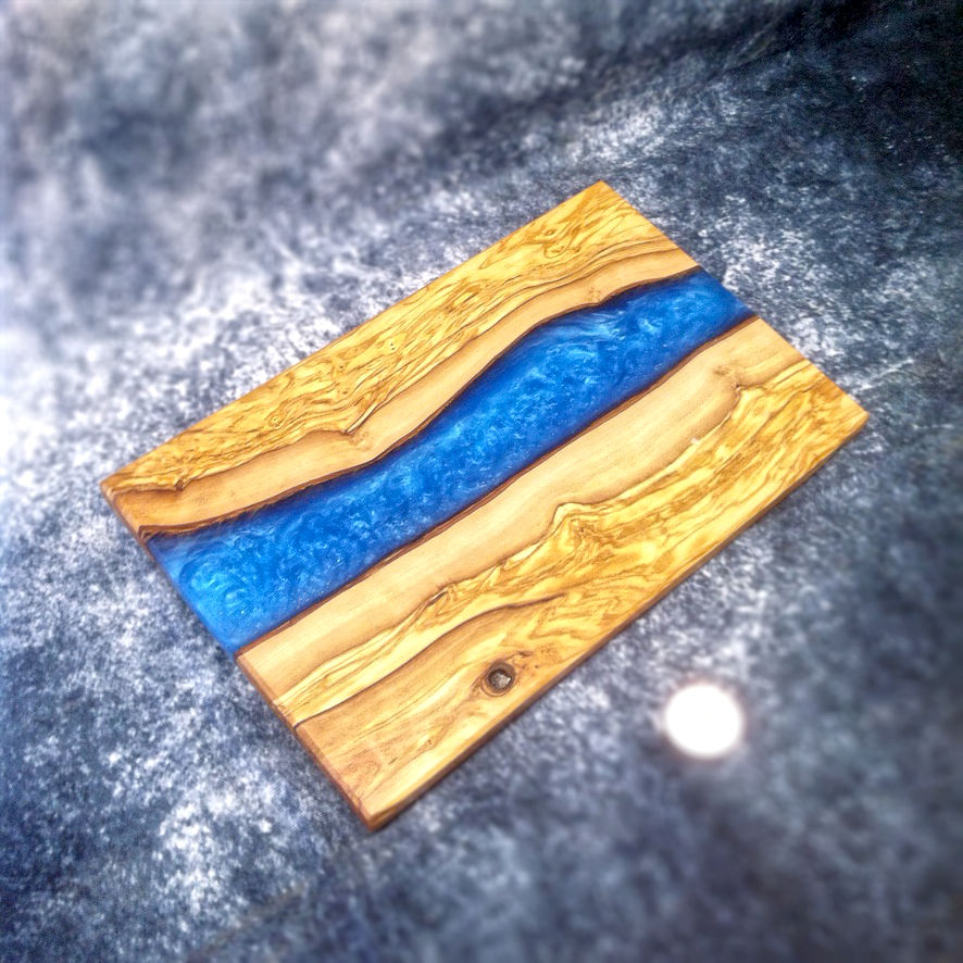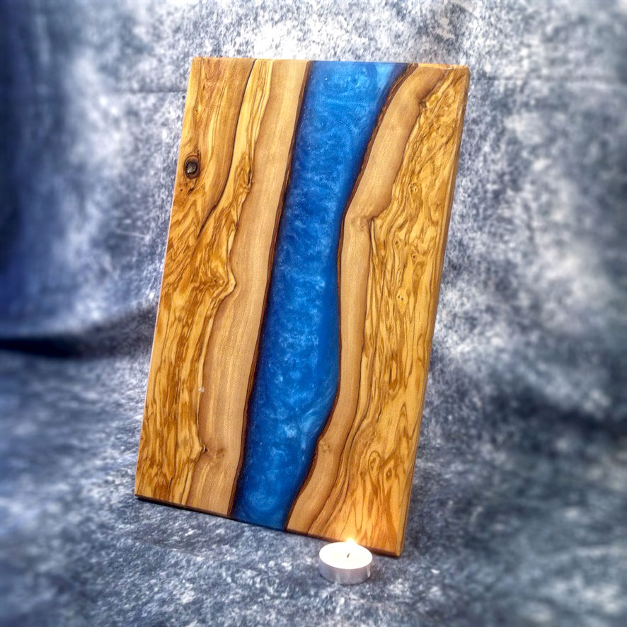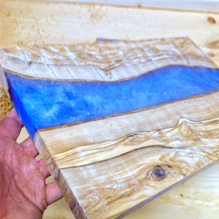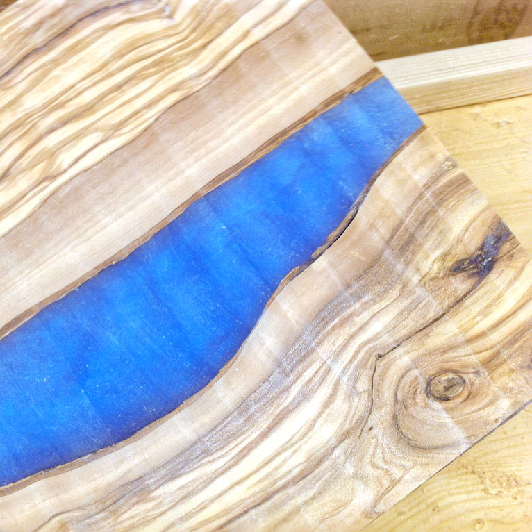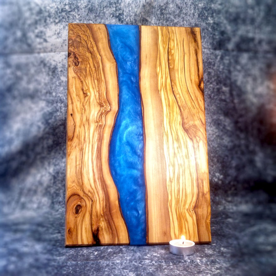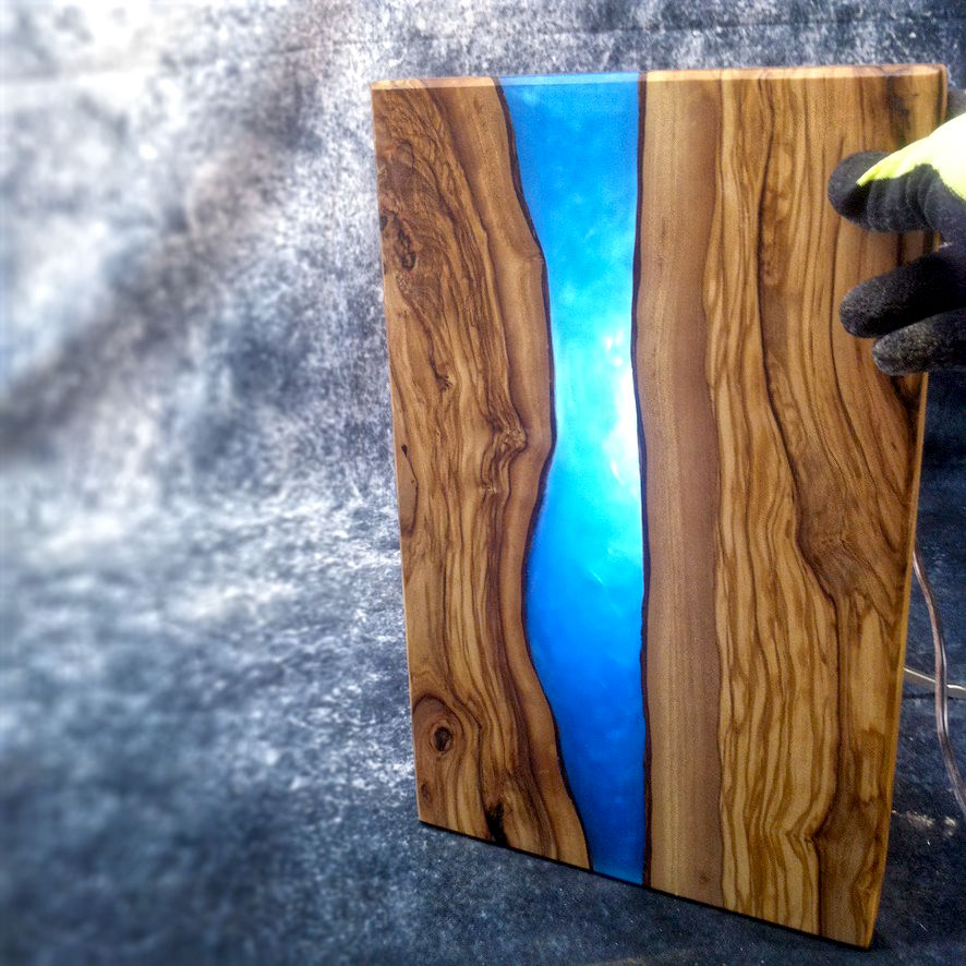 - Preparation: The olive wood slabs were carefully flattened, sanded, and sealed to prevent the resin from seeping into the grain. They were then secured into a custom-built mould.